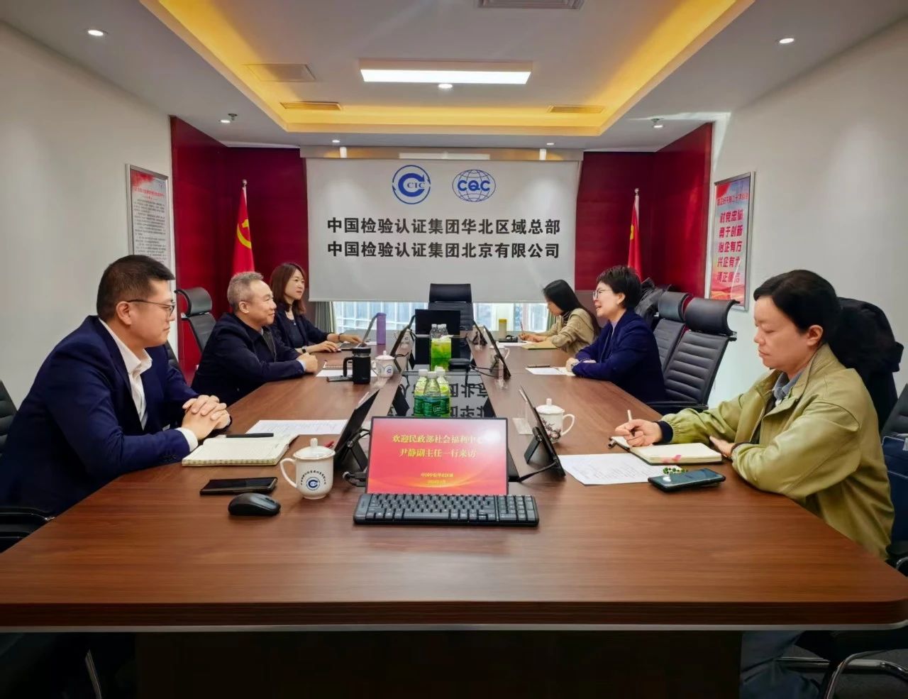 3月31日,民政部社会福利中心党委委员、副主任尹静一行到访中国中检华北区域。中国中检华北区域党委书记、董事长、总经理王海龙出席会议。双方围绕养老标准制定、养老服务质量评价、科技助老等进行深入交流,共同探讨助力银发经济高质量发展的合作路径。